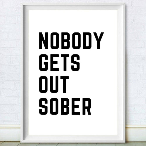 Our Nobody Gets Out Sober Print Black & White is one of our range of Kitchen Prints . Each wall picture print has been designed in-house and is printed to order. Our small team take a great deal of care to ensure all print orders are despatched promptly and arrive with our customers in pristine condition.