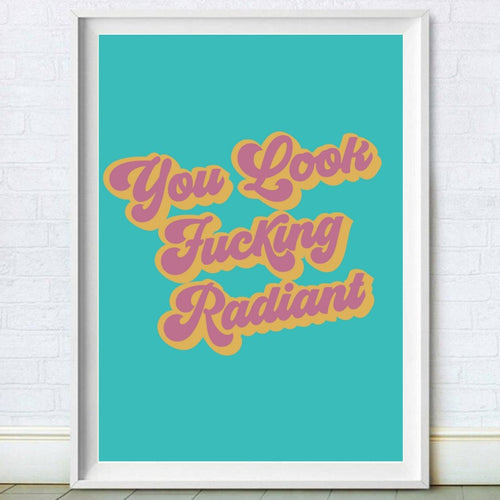 You Look F*cking Radiant Positive Print is one of our inspirational and motivational feel good prints. All the prints in our collections are designed in-house and your order is carefully printed and packed in our design studio. Other positive prints available: wise woman 'wise woman' motivational poster, 'life is tough' motivational print, 'a woman should be 2 things...' Coco Chanel print, beautiful Here Comes the Sun Print and our colourful 'Love' polka dot print.